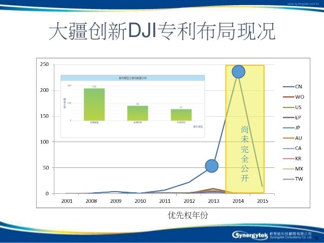 但最受市場矚目同時也是空拍機的領導廠商深圳大疆創新DJI,目前則是在中國大陸專利申請量最多的企業,由於DJI在2012年後才開始比較大規模的進行專利佈局,主要的發明專利會在這幾年才會獲得授權,其他後進的業者未來若只是單純的抄襲大疆DJI空拍機的外型或是機構設計,而不思考如何改善或是進行迴避設計的話,未來面臨專利訴訟的風險的機會應該是蠻高的