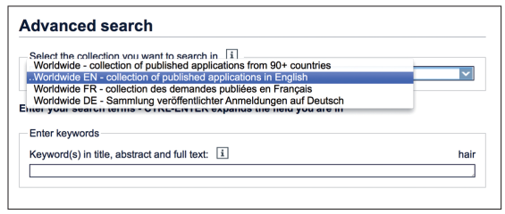 若要在進階檢索使用全文檢索功能,請從選擇檢索資料庫的下拉式選單選取 Worldwide EN (或 FR 或 DE) 資料庫,這樣就可進入全文檢索模式。