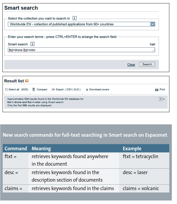 Espacenet 的全文檢索功能已於2016 年 3 月 15 日正式上線,可在進階檢索 (Advanced search) 和簡易檢索 (Smart search) 使用,目前支援的檢索語言有英語、法語和德語,日後會再陸續加入其他歐洲語言。