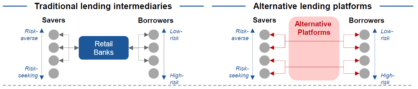 傳統上,個人或是企業都是向銀行體系借款支付利息,而銀行則發放較低的利息從民間吸收存款,而中間的利差,就是做為銀行的利潤以及承擔借款倒帳的風險損失所用。由於銀行規模越來越大,因為控管資金風險以及增加營運效率,通常造成一些急需資金的個人或是新創或中小企業無法從銀行體系取得貸款,而這些企業就需要不同的融資管道,才能解決它們的資金需求,而P2P 貸款就是解決這類問題的其中一種融資模式。P2P 貸款有點類似台灣民間常用的『標會』,即親朋好友之間將一定額度的資金聚集,然後借貸給有資金需求的人的一種商業模式。隨著網際網路的普及,歐美首先出現了一批運用網際網路的技術便利和成本優勢,讓借貸脫離金融體系的 P2P 借貸公司,其中以 並以2005年於英國倫敦成立的 Zopa 名氣最大,目前已經有超過5萬人在此平台上借款, 共借出 14.3 億英鎊。