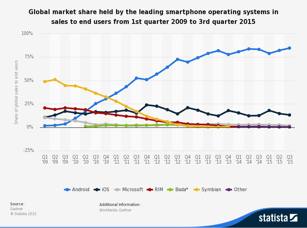 圖片:全球主要手機市場市佔率趨勢 (2009Q1~2015Q3)