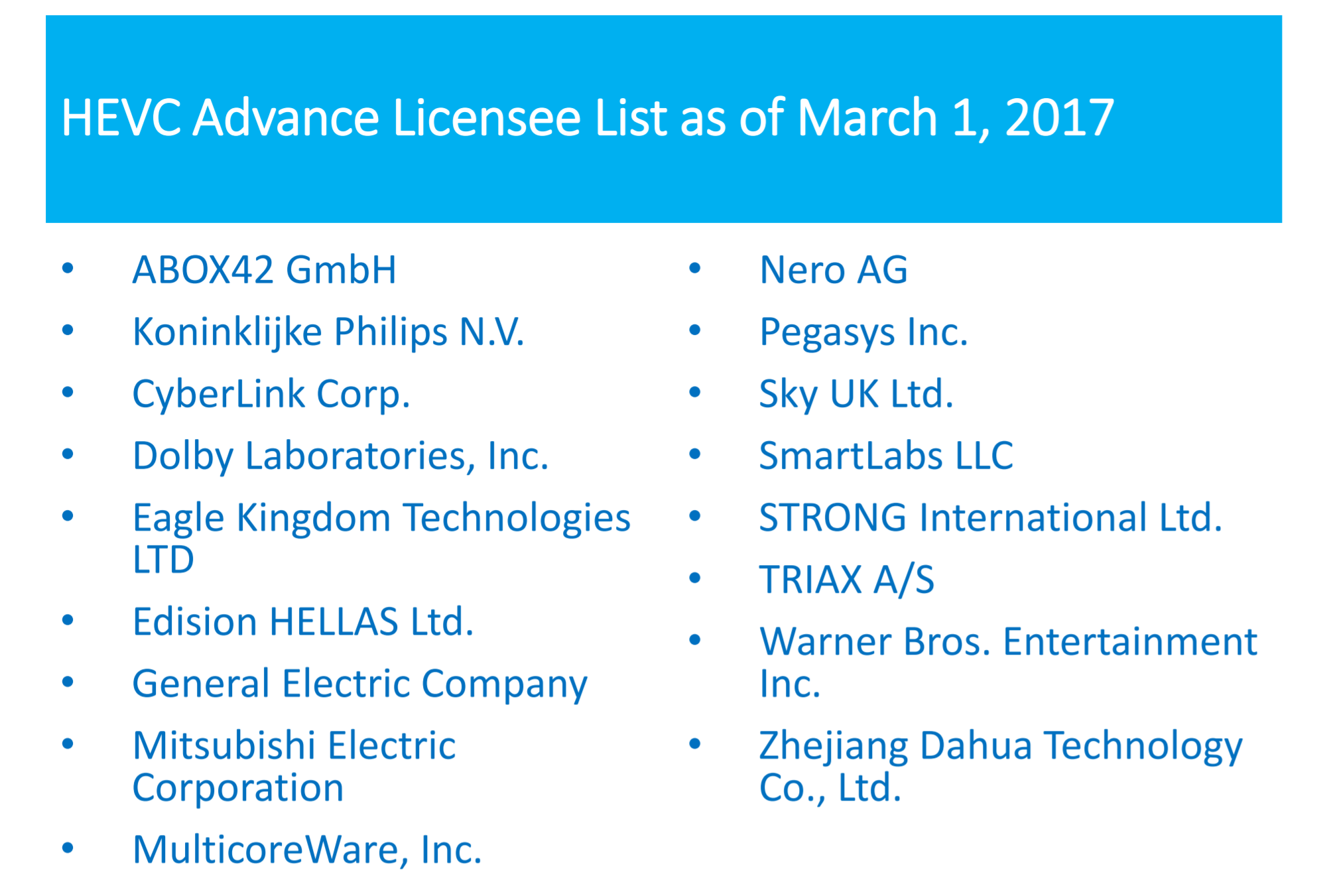 根據 HEVC Advance 一月份統計,該公司已經掌握790件專利(三月份已經成長到846件專利),其中有1172個權利項已被判為基礎(涵蓋到HEVC/H.265技術的標準規格)