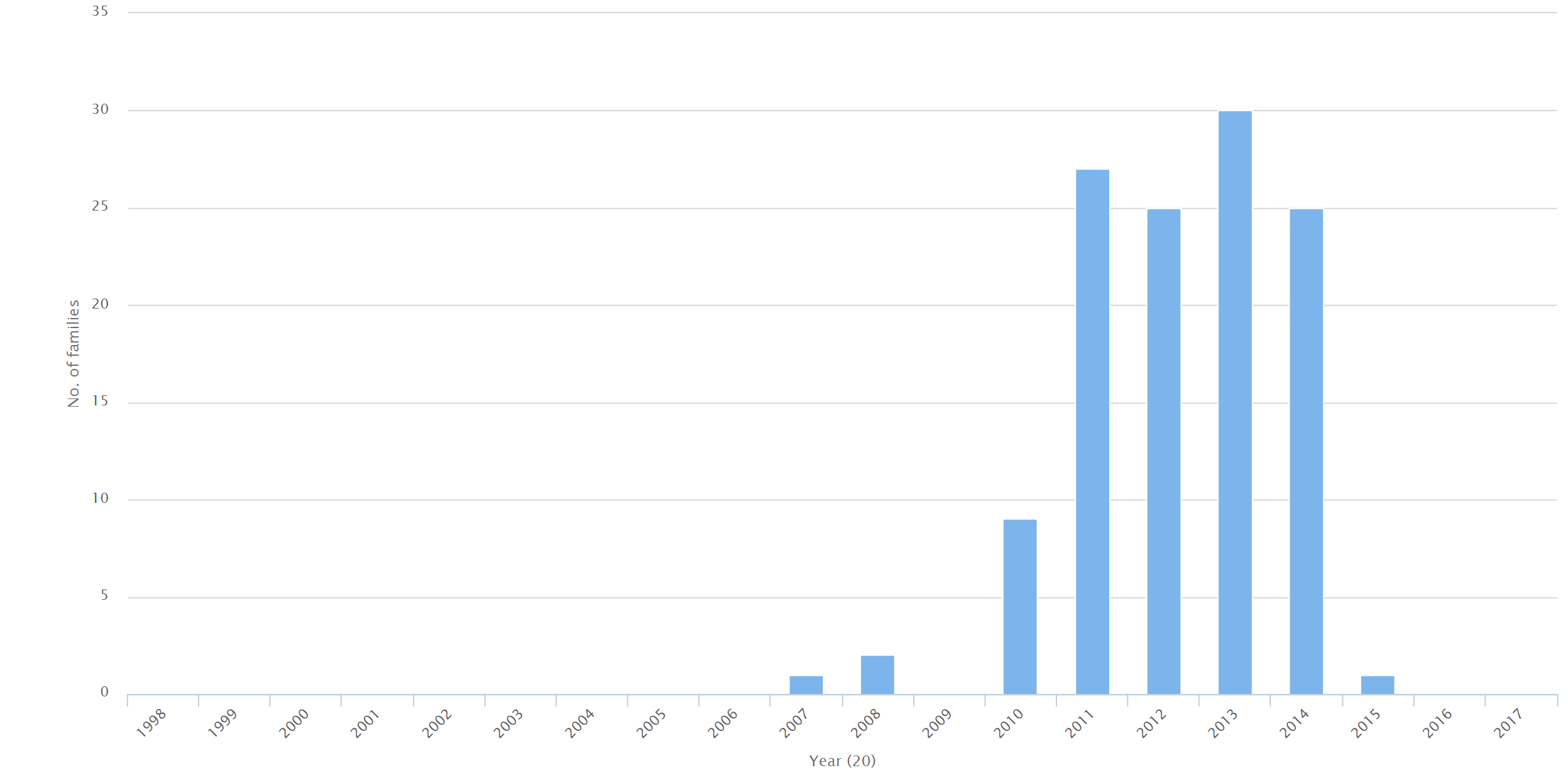 國內IC設計業龍頭聯發科去年初公告為有效管理及運用專利資產,以1450萬美元(約4.75億台幣)將手中466件專利賣給旗下子公司寰發公司(HFI Innovation)。由於專利移轉的資訊已經於去年底陸續公開,新聚能科技顧問進一步分析該專利組合,主要可合併為120件專利家族(同族專利),按最早母案的申請年份統計,這批專利主要的申請年份集中在2011年至2014年。