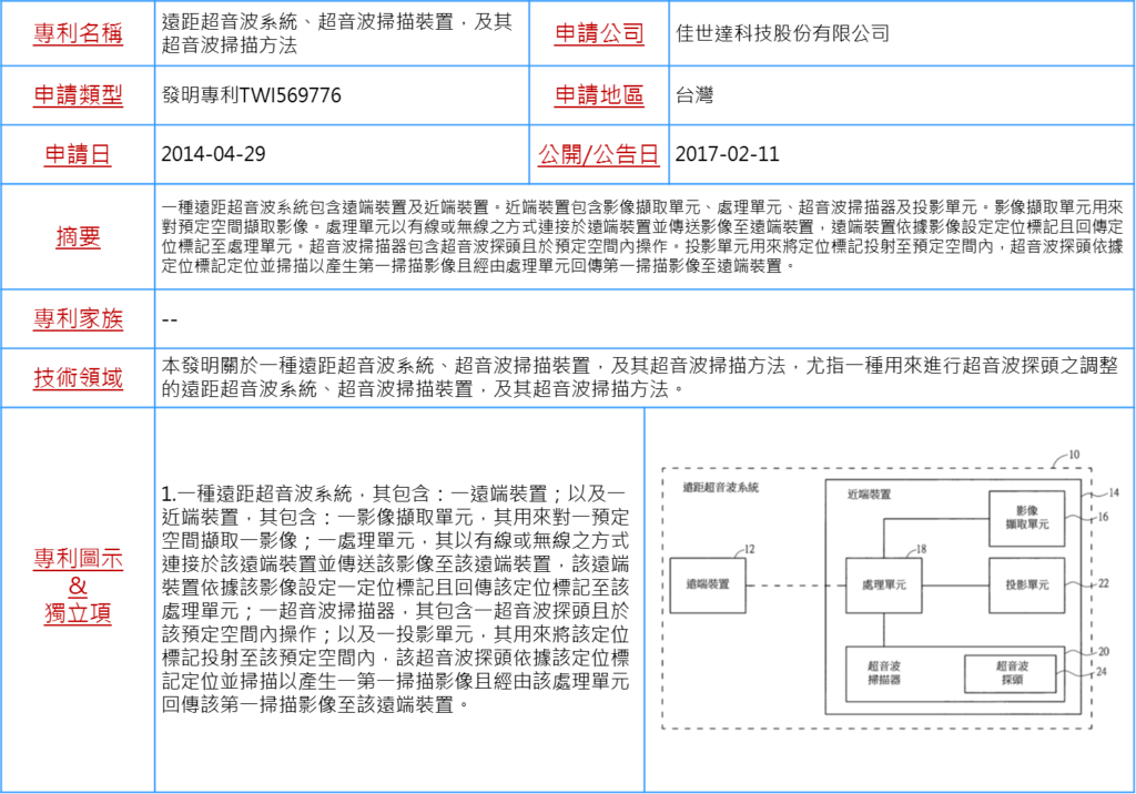 台灣大型科技集團也早已開展醫療領域的布局,從醫療健康管理平台或是電子醫療器材領域切入,或是利用與醫院或是醫材廠商合作開發的方式拓展醫療領域的業務,其中就有鴻海所成立的永齡健康基金會與台大醫院合作建構兼具Service(服務)、Management(管理)、Architecture(建築)、Research(研發)及Technology(科技)的「S.M.A.R.T.」的智慧醫院,另外佳世達近兩年開始入股、併購醫療相關公司,推動新公司上市(IPO),也開發遠距超音波診斷裝置,請見以下專利: