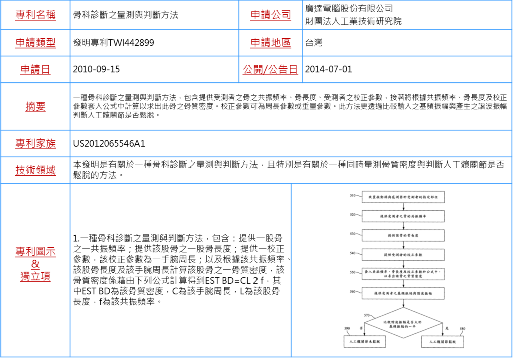 而大部分科技廠商在投入醫療器材領域時,不外乎是針對老年好發的慢性疾病,例如心血管疾病或是糖尿病的心跳、血壓或是血糖數值的監控設備進行布局。另一種常好發於老年人及停經婦女的疾病為骨質疏鬆症,其主要併發症是發生各部位的骨折,一旦老人發生骨折造成行動上的不便,後續將會產生許多照護上的困難,目前醫學界還未有安全而有效的方法,幫助已疏鬆的骨骼恢復原狀,對於骨質疏鬆的目前僅能藉由注意自身的骨質密度 維持正常生活習慣、攝取足夠鈣質及維他命D,為預防骨質疏鬆症的不二法門,為此廣達則是與工研院合作進行骨質酥鬆診斷設備之開發,請見以下專利: