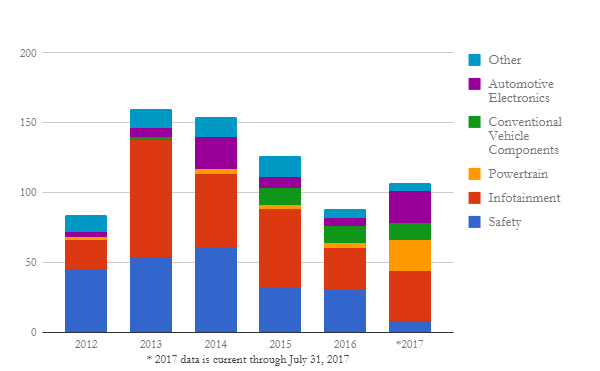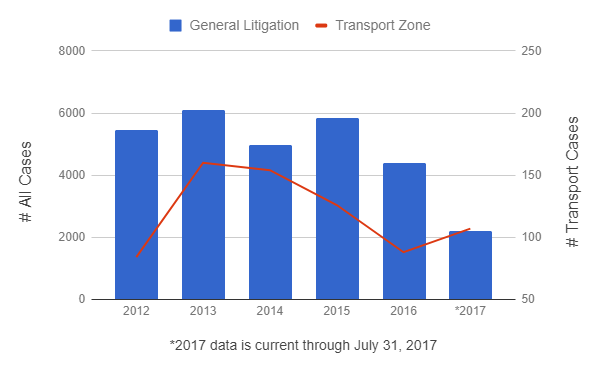 從2012年至2016年,運輸領域訴訟與整體專利訴訟相同,在2013年達到巔峰之後便開始減少,但在2017年,運輸領域截至7月31日的訴訟已經超越2016年總量,主要原因是針對汽車電子和車用娛樂資訊系統主張的訴訟增加之故。