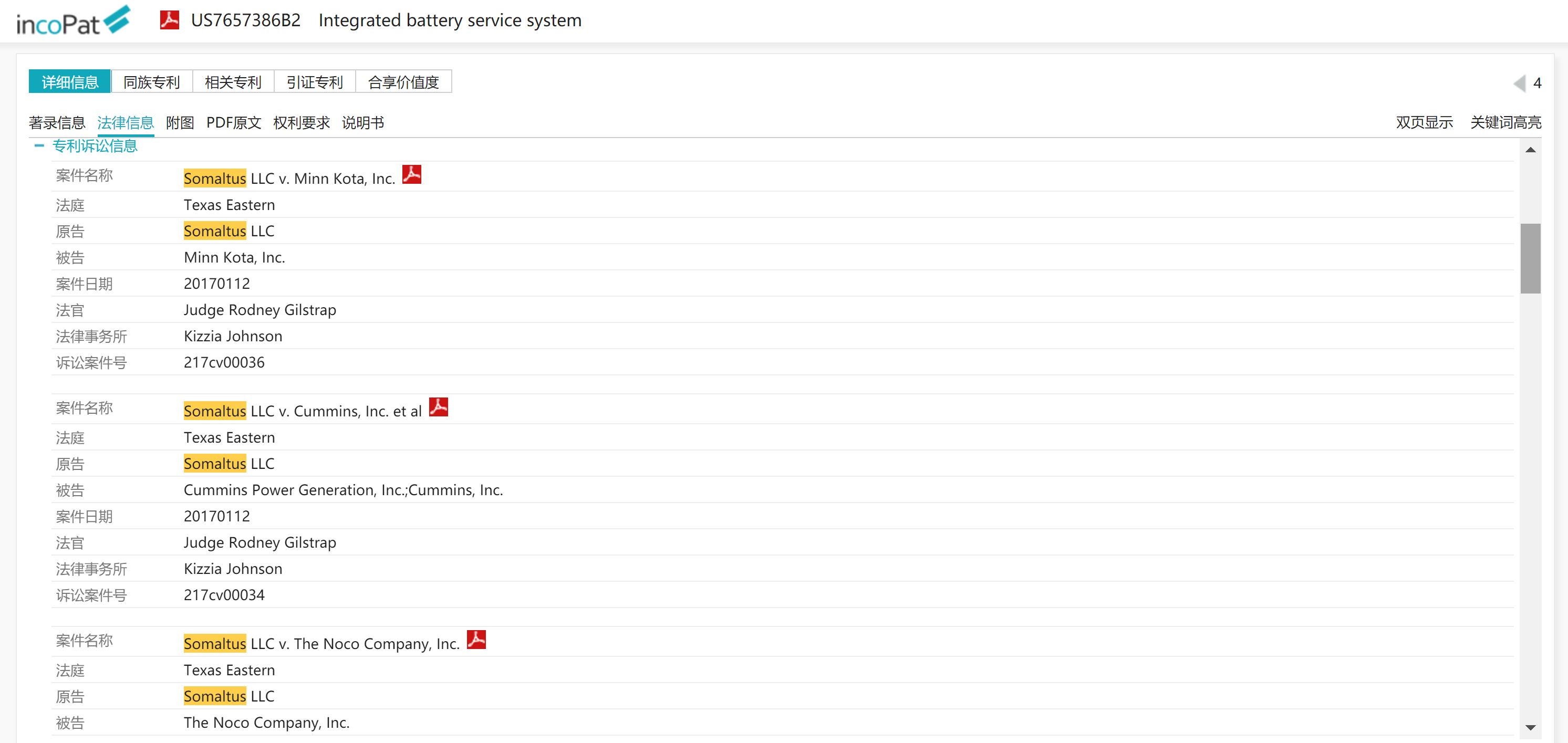 1.Somaltus (10) : 可能是 IP Edge LLC 的關係企業,2017年用US7657386 Integrated battery service system (原始專利權人Snap-On Technologies Inc) 這篇與快速充電技術相關的專利起訴多家公司。