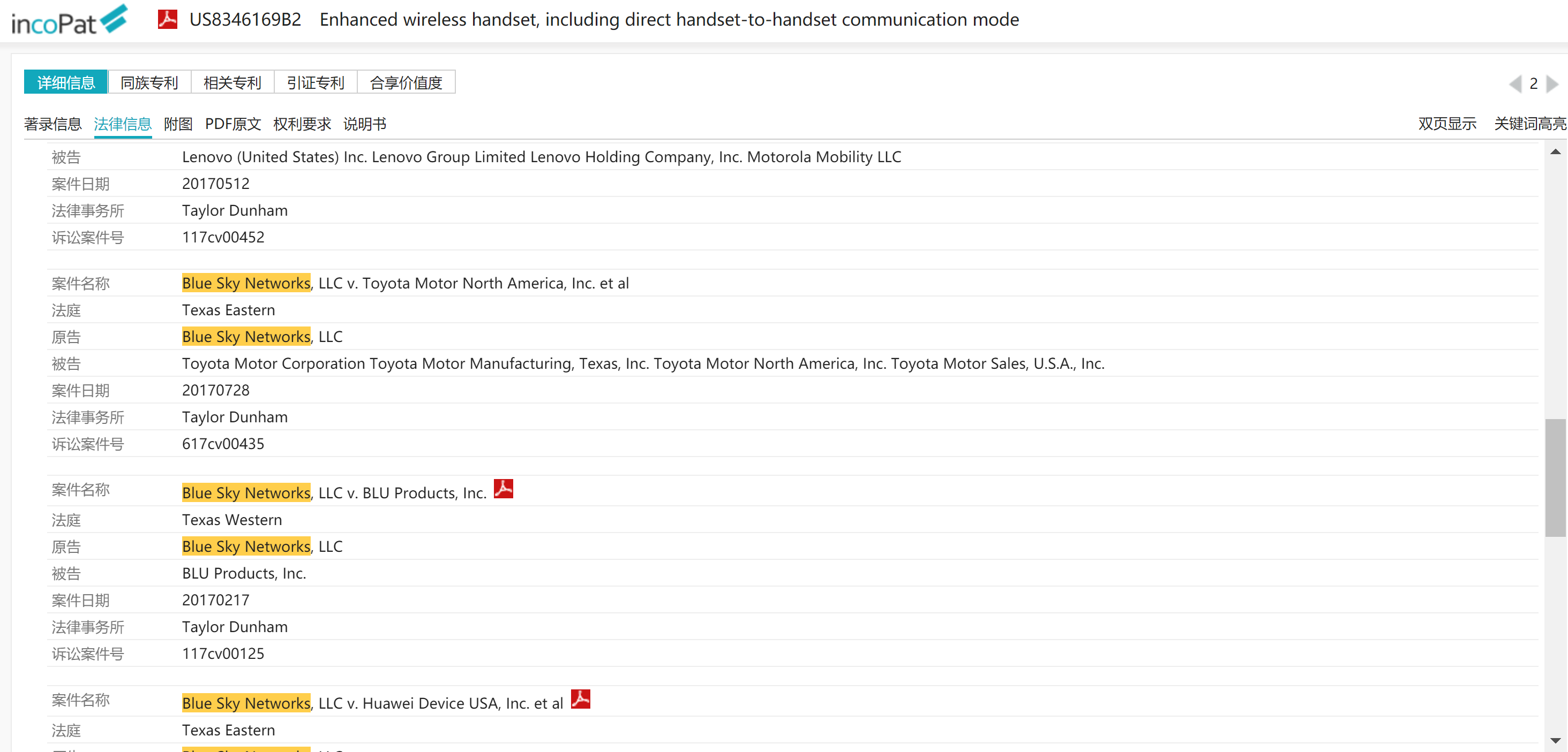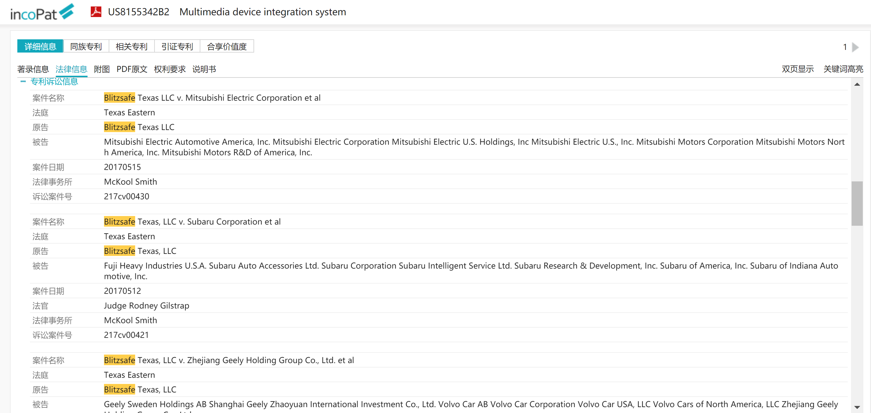 2. Blitzsafe Texas (8) : 透過自MARLOWE PATENT HOLDING 移轉取得的專利US7489786 Audio Device Integration System 及 US8155342 Multimedia Device Integration System 於2017年起訴Bosch, Daimler AG, Subaru, Mazda, 浙江吉利汽車等公司。