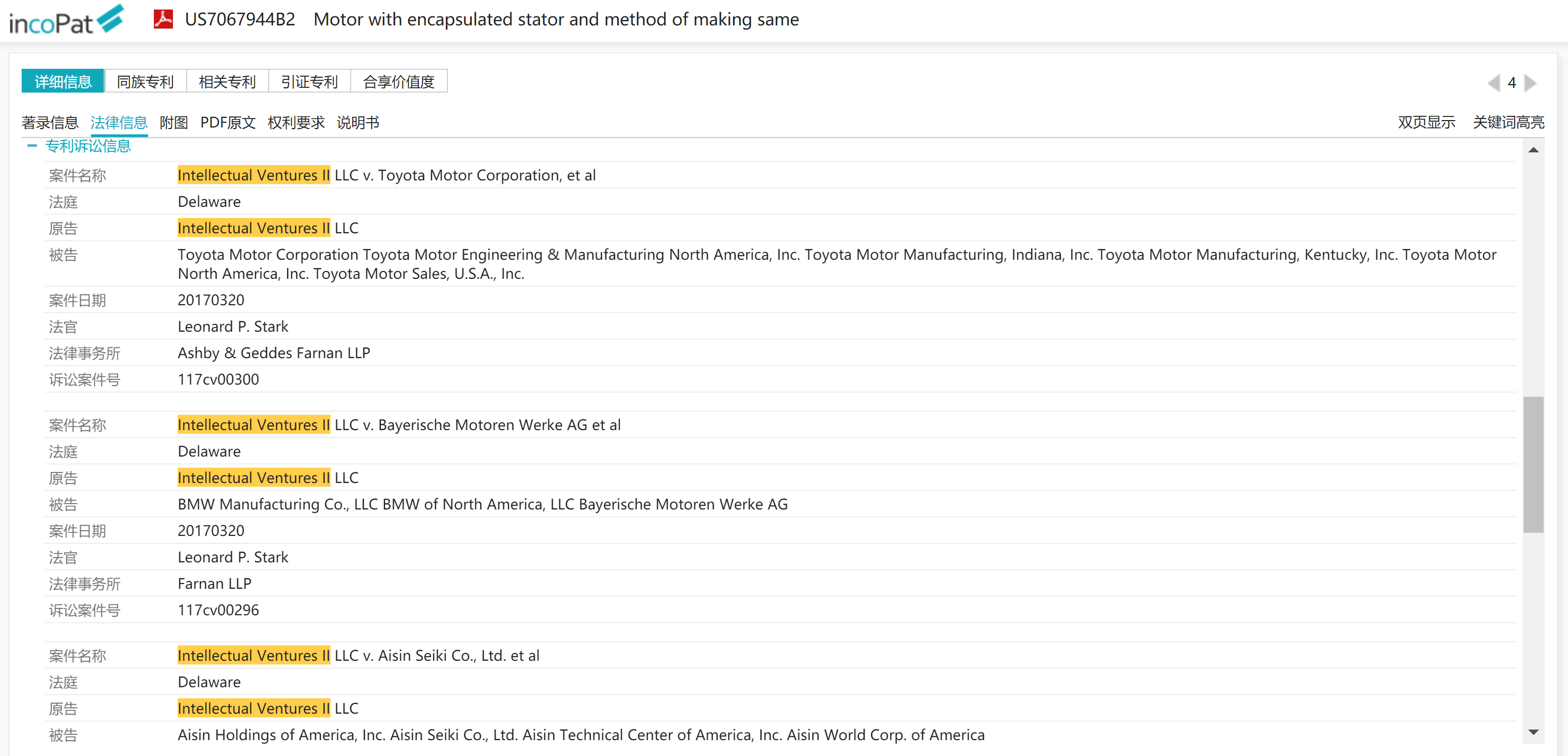 3. Intellectual Ventures II (7) : 透過複雜的合併及移轉程序,取得源自於 Encap Motor公司的 US7067944 Motor with encapsulated stator and method of making same 透過ITC程序向Toyota、Nissan、BMW等公司的車款提出訴訟。