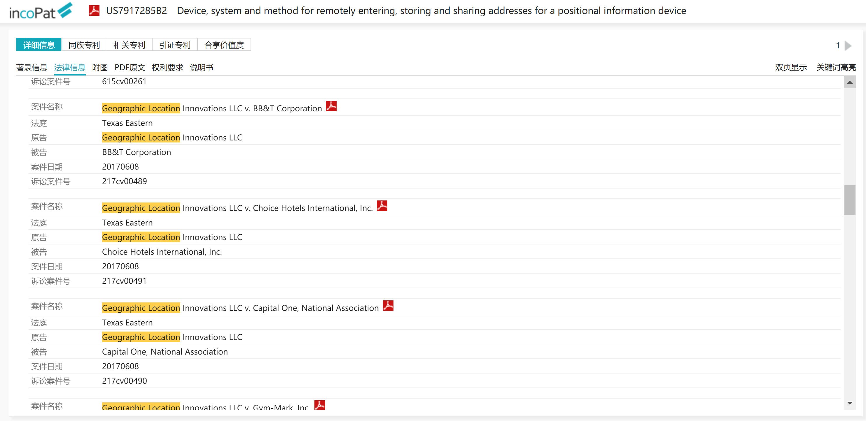 4.Geographic Location Innovations (6) : 同樣也是取得經歷了多次移轉歷程的 US7917285 Device, system and method for remotely entering, storing and sharing addresses for a positional information device 專利,對 Ford, Lyft, Safeway 等多家公司提出訴訟。