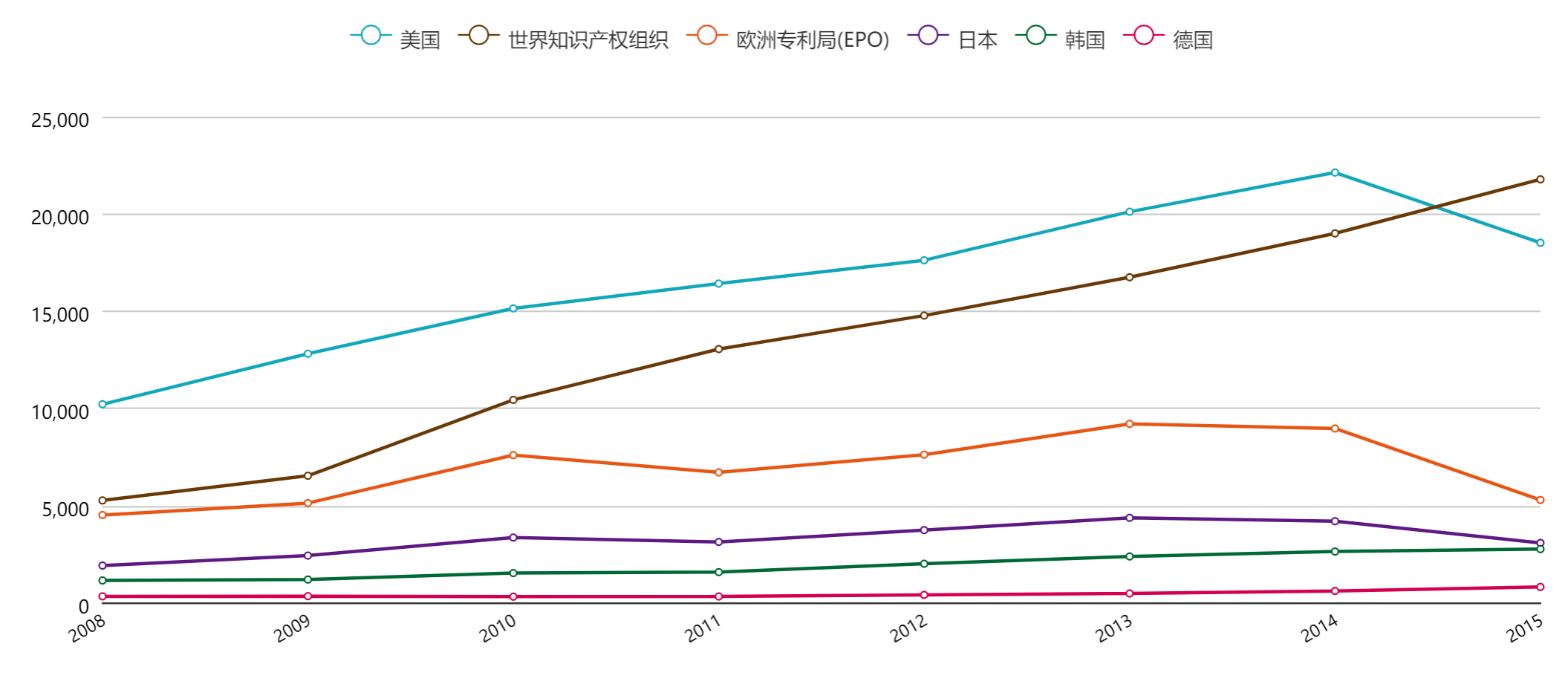 圖說: 六大專利局中以中國優先權案的申請趨勢 (2008-2015)