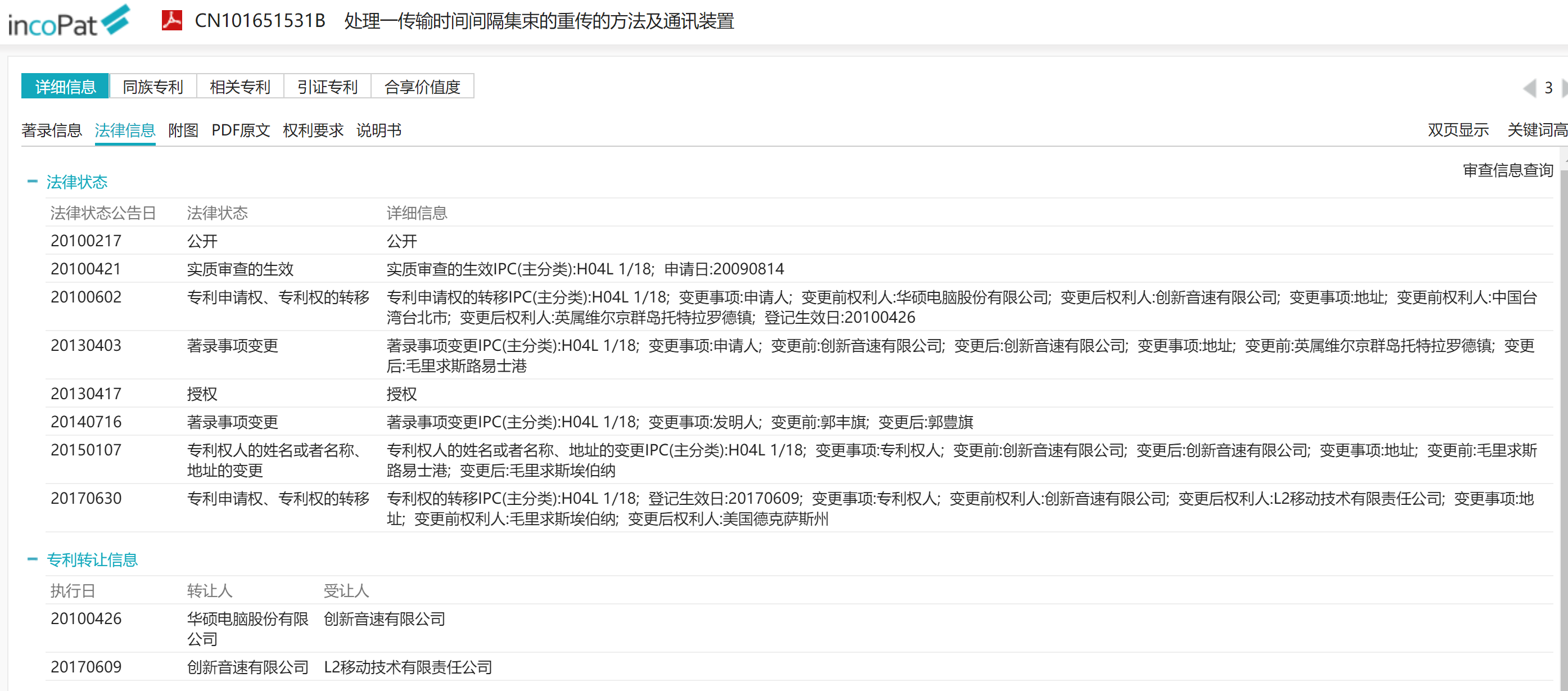 圖說:CN101651531法律狀態與轉讓訊息