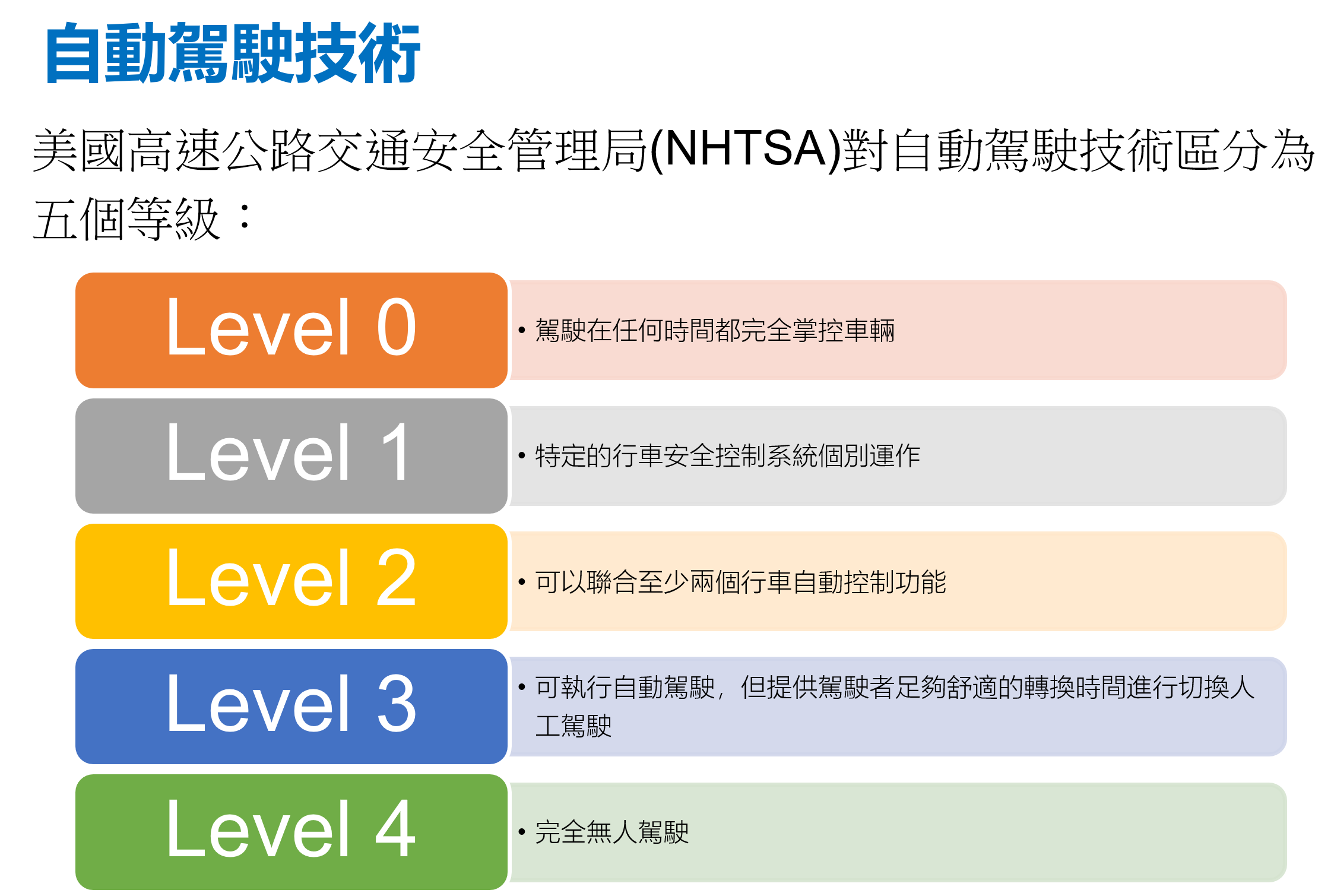 隨著近年自動駕駛技術廣泛受到關注,美國國家公路交通安全管理局(NHTSA)也將自動駕駛車定義為5種不同的發展階段。其中,Level 3表示“有條件自動駕駛化”,也就是“存在著監控駕駛人的潛在需要,以確保從自動駕駛轉換到手動駕駛時,駕駛人隨時準備好接管車輛” 。而多家汽車品牌近期也將符合Level3的自動駕駛功能列入產品開發排程,預計將在2018年陸續發表上市。而Tesla則是其中的領跑者。