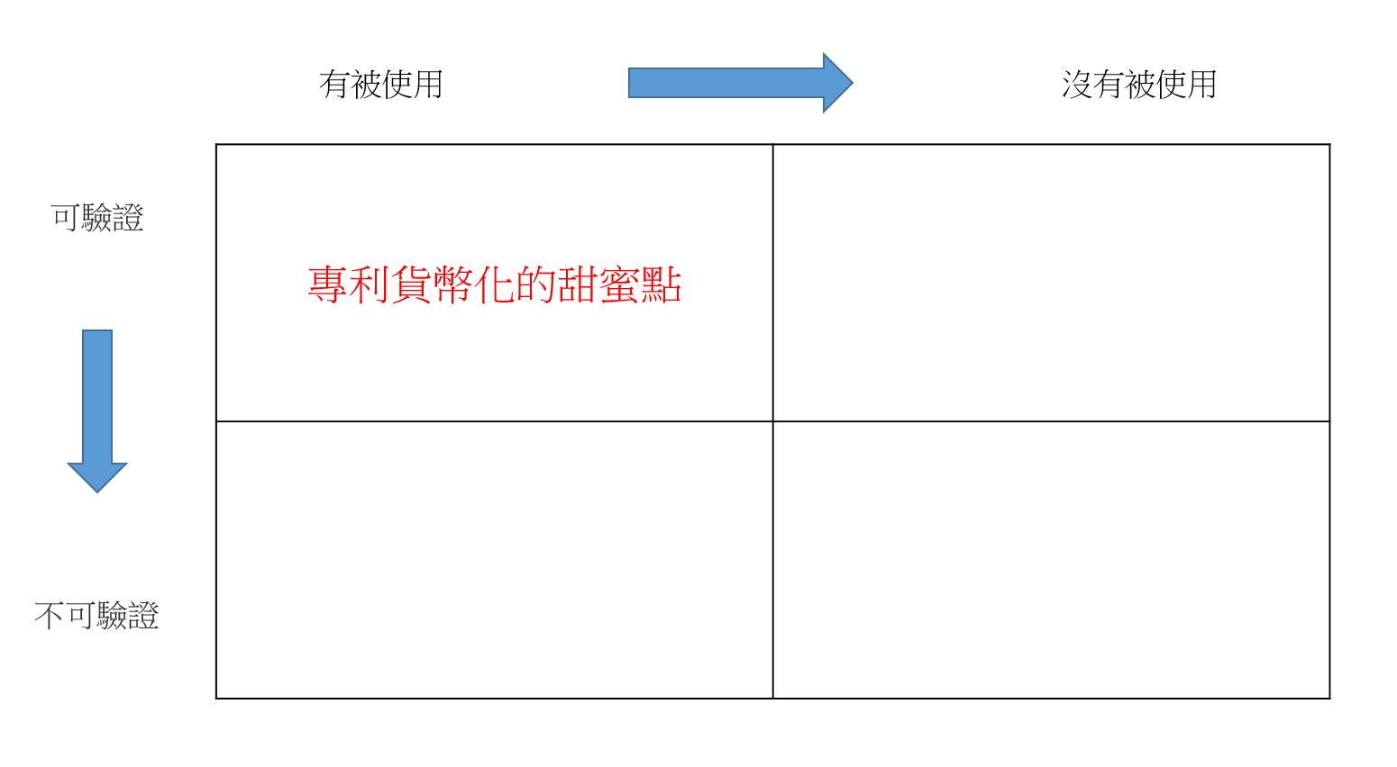 在審查使用證據(EoU)時,圖1的四個象限可以幫助識別適合貨幣化的專利。橫向與縱向座標分別衡量專利是否被現有產品使用,以及可能用途的可驗證性,每個專利都可歸入其中一個象限,左上象限中的專利是有被使用且可驗證的專利,是專利貨幣化的理想目標,不過,一般專利組合通常只有2%-5%的專利會落在這個象限。