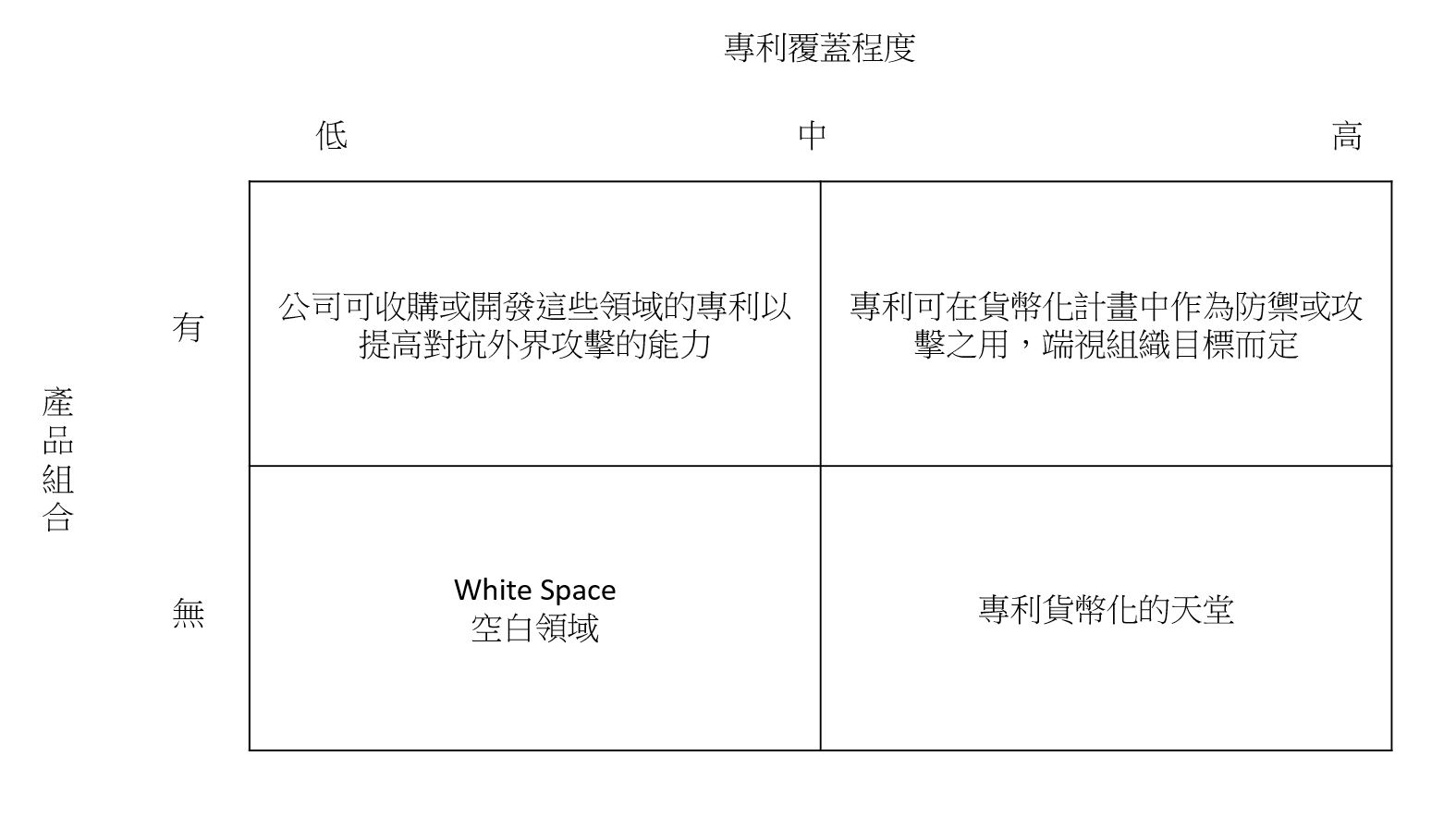 - 空白領域:既無產品也沒專利,這是公司未來可以發展的領域。