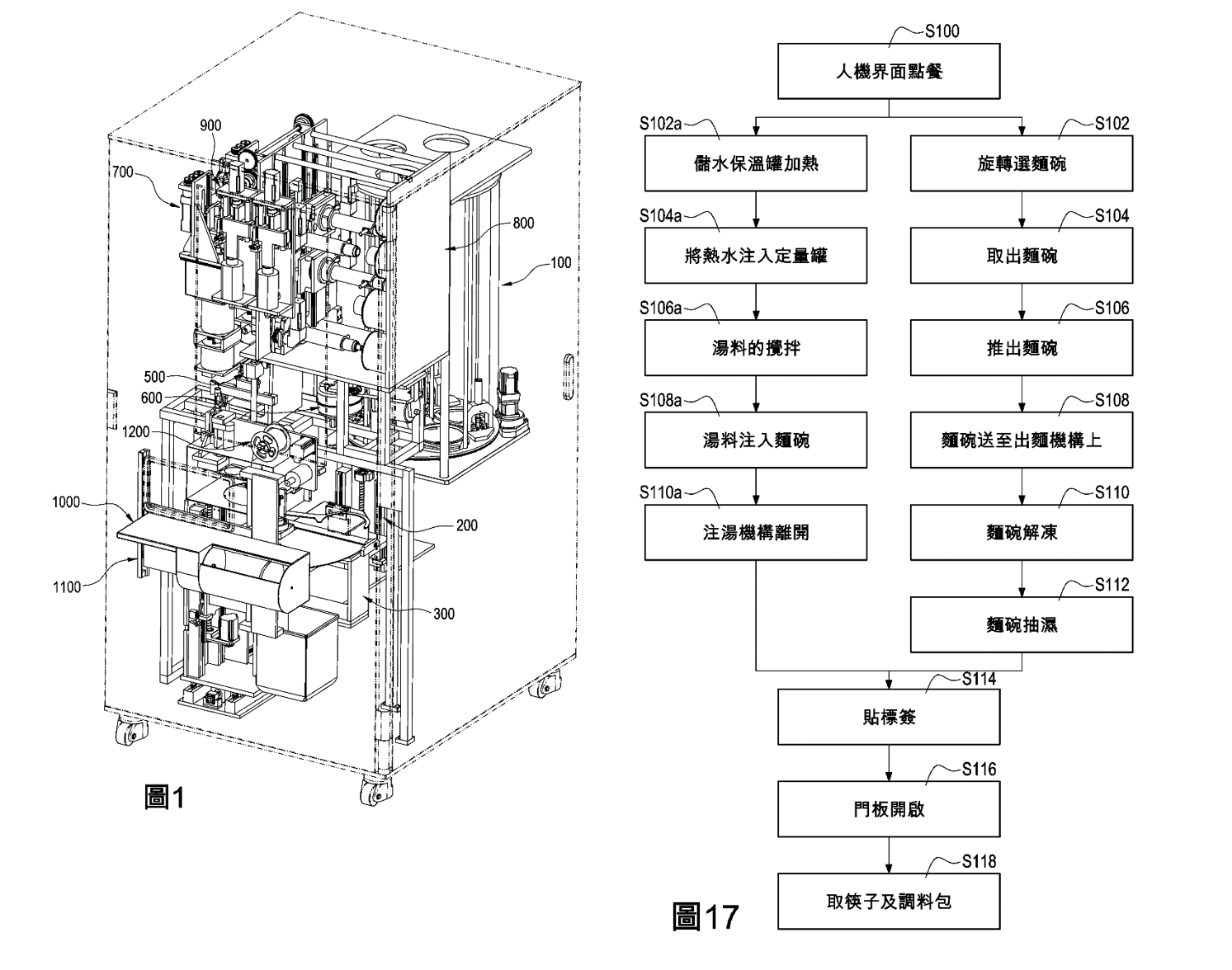 自動煮麵機的專利是一種自動麵食販賣機及其控制方法,利用旋轉臂將麵碗依序推送至不同機構,依序進行取麵、出麵、解凍、加熱、攪拌、注湯動作,最後完成具有湯汁的麵碗蒸煮。